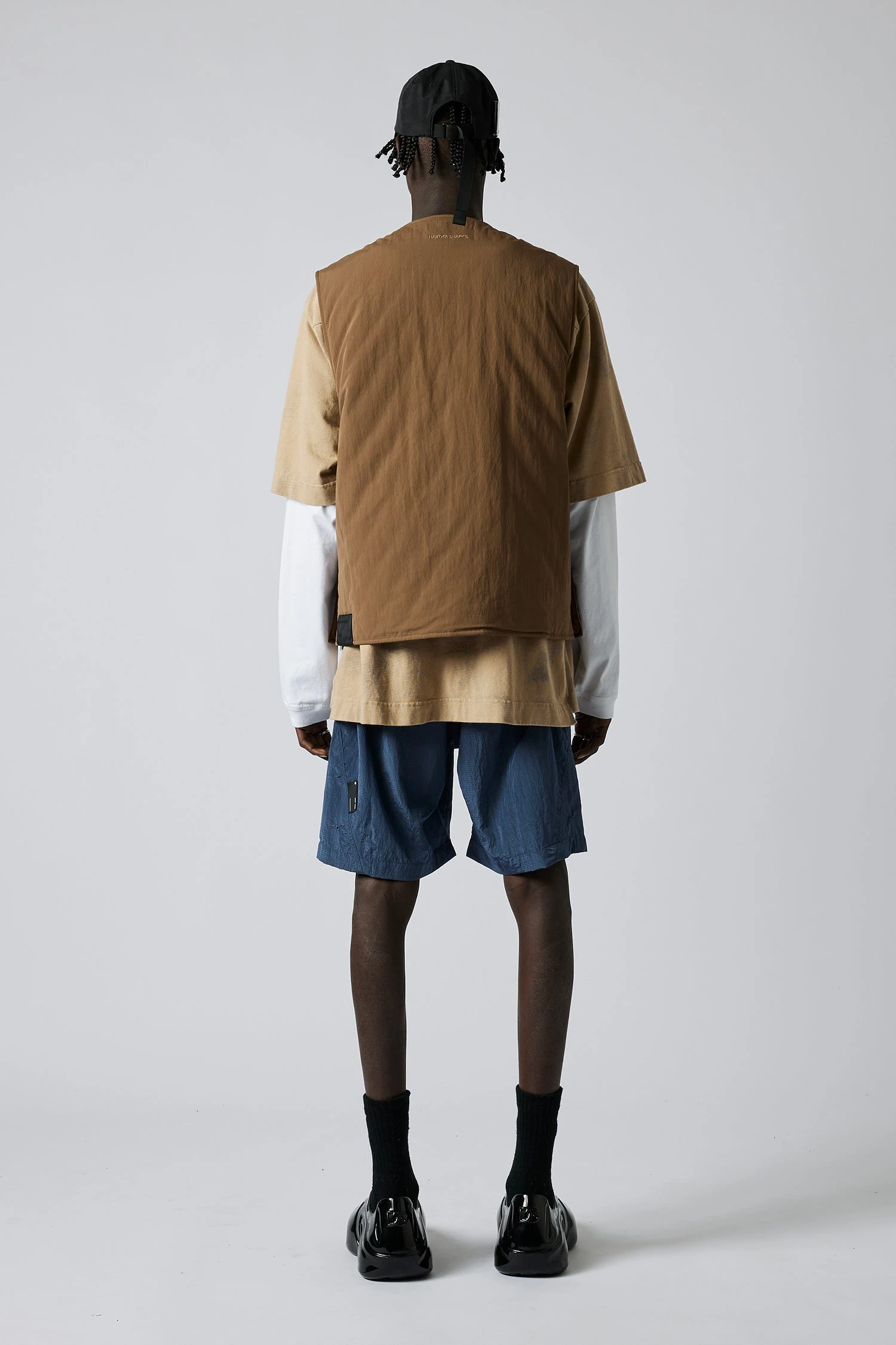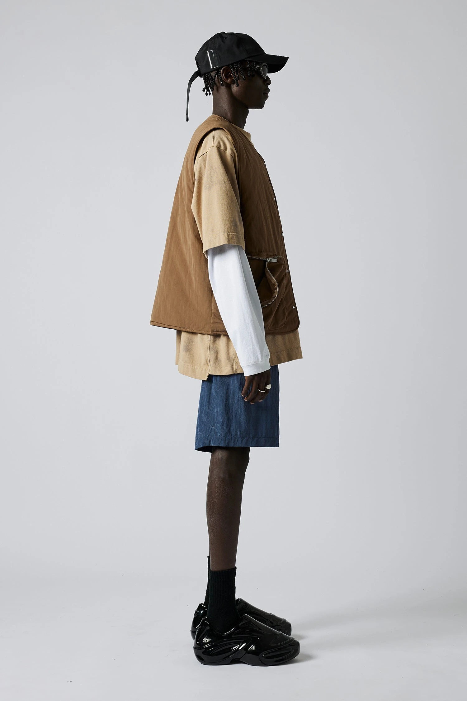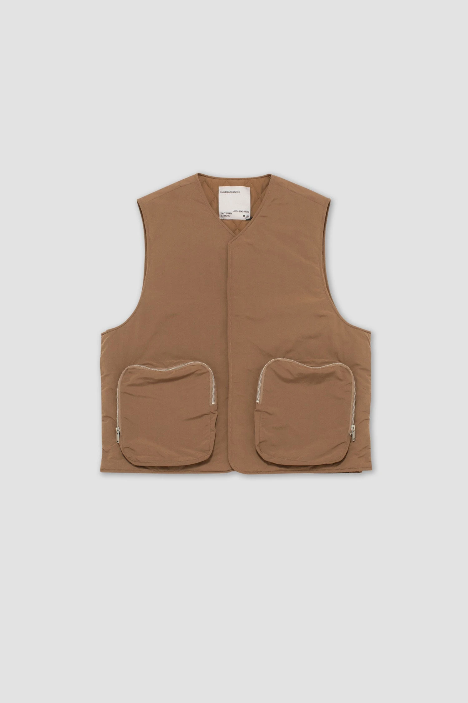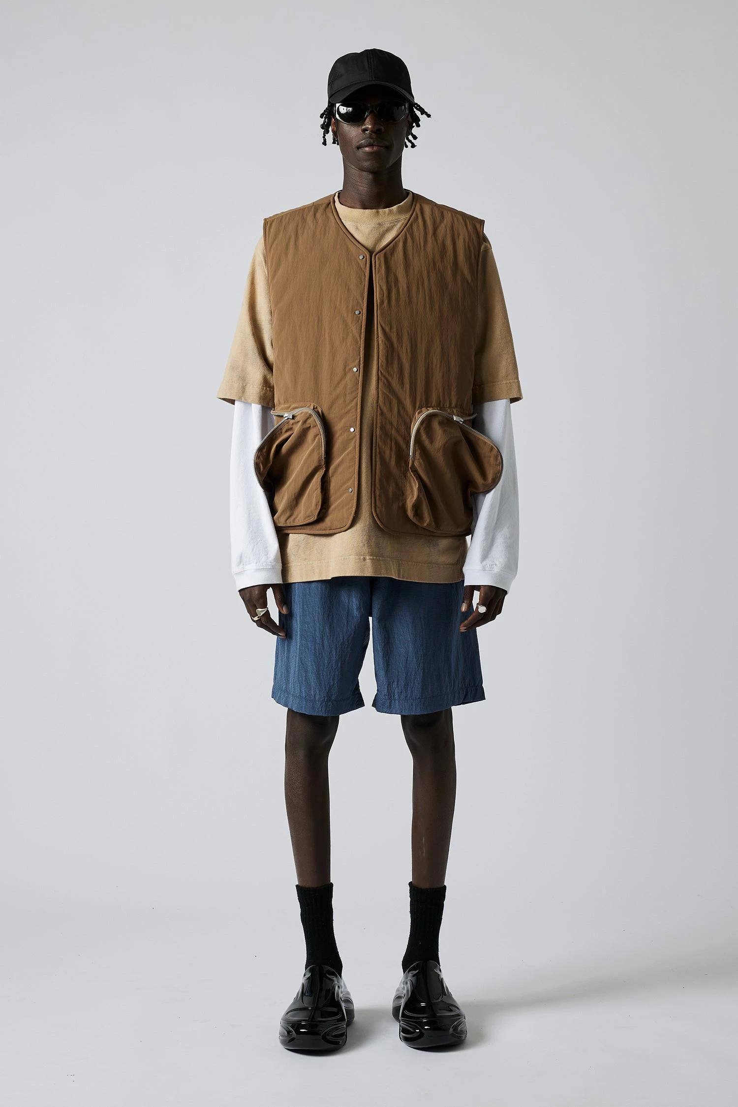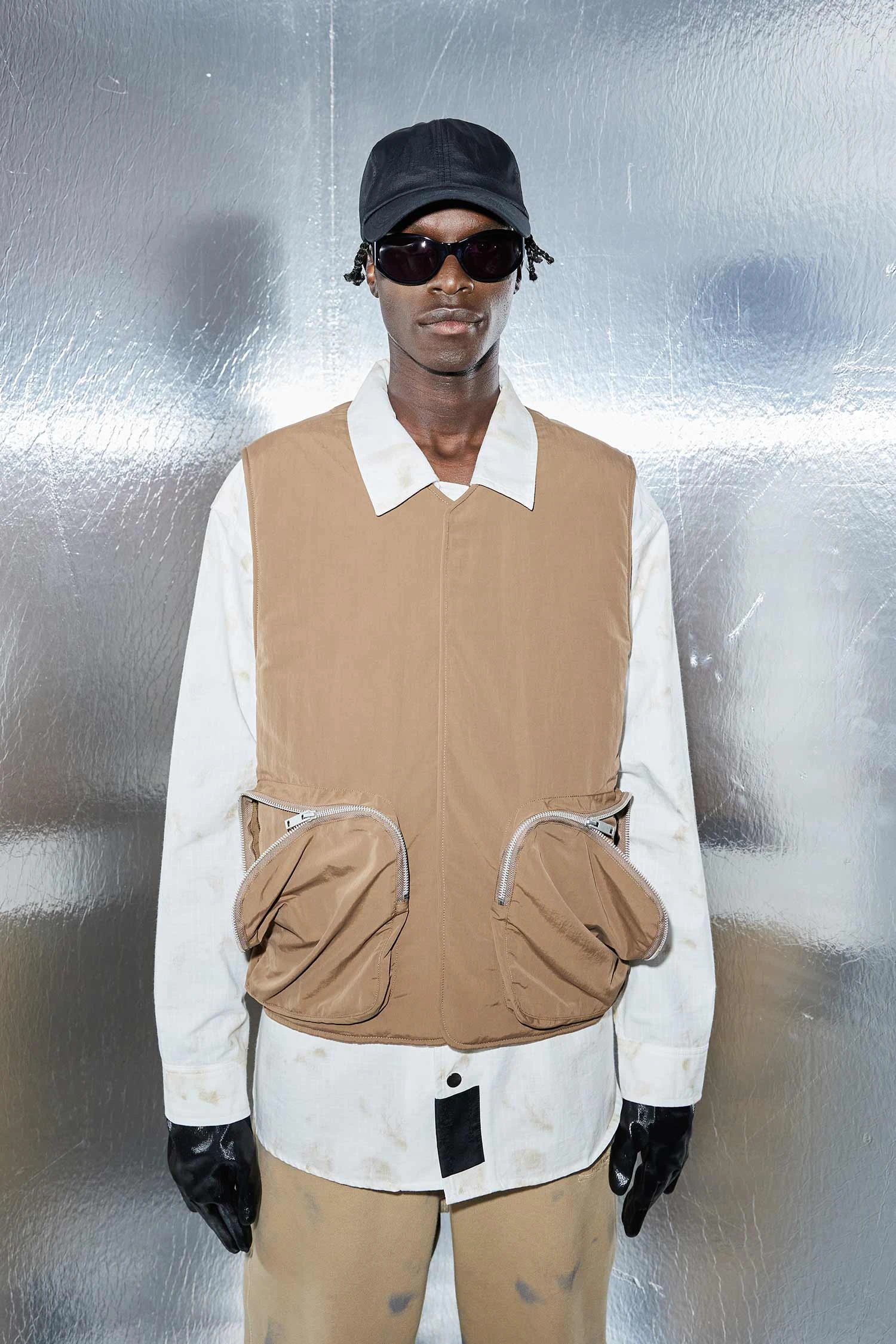 Made of custom woven 105 gsm peached poly nylon fabric with a light recycled down lining, this outwear shirt design features large utility pockets with oversized zip detail.